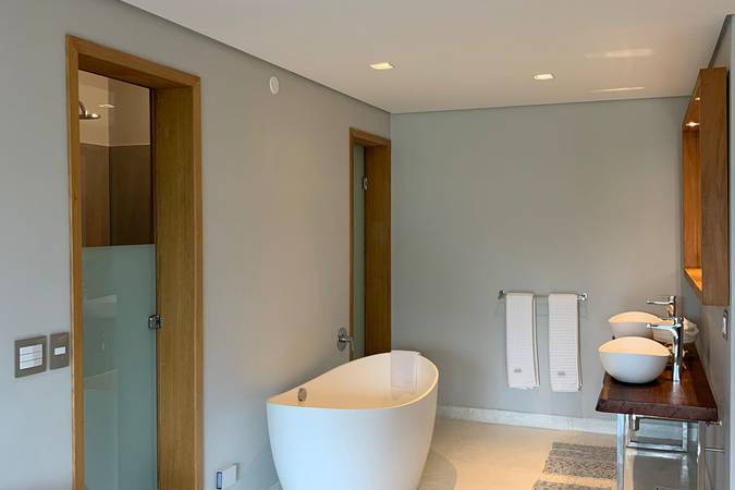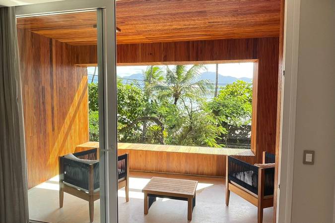 Com vista para o mar e decoração moderna, o quarto é equipado com uma banheira de imersão e uma varanda de tirar o fôlego.