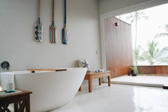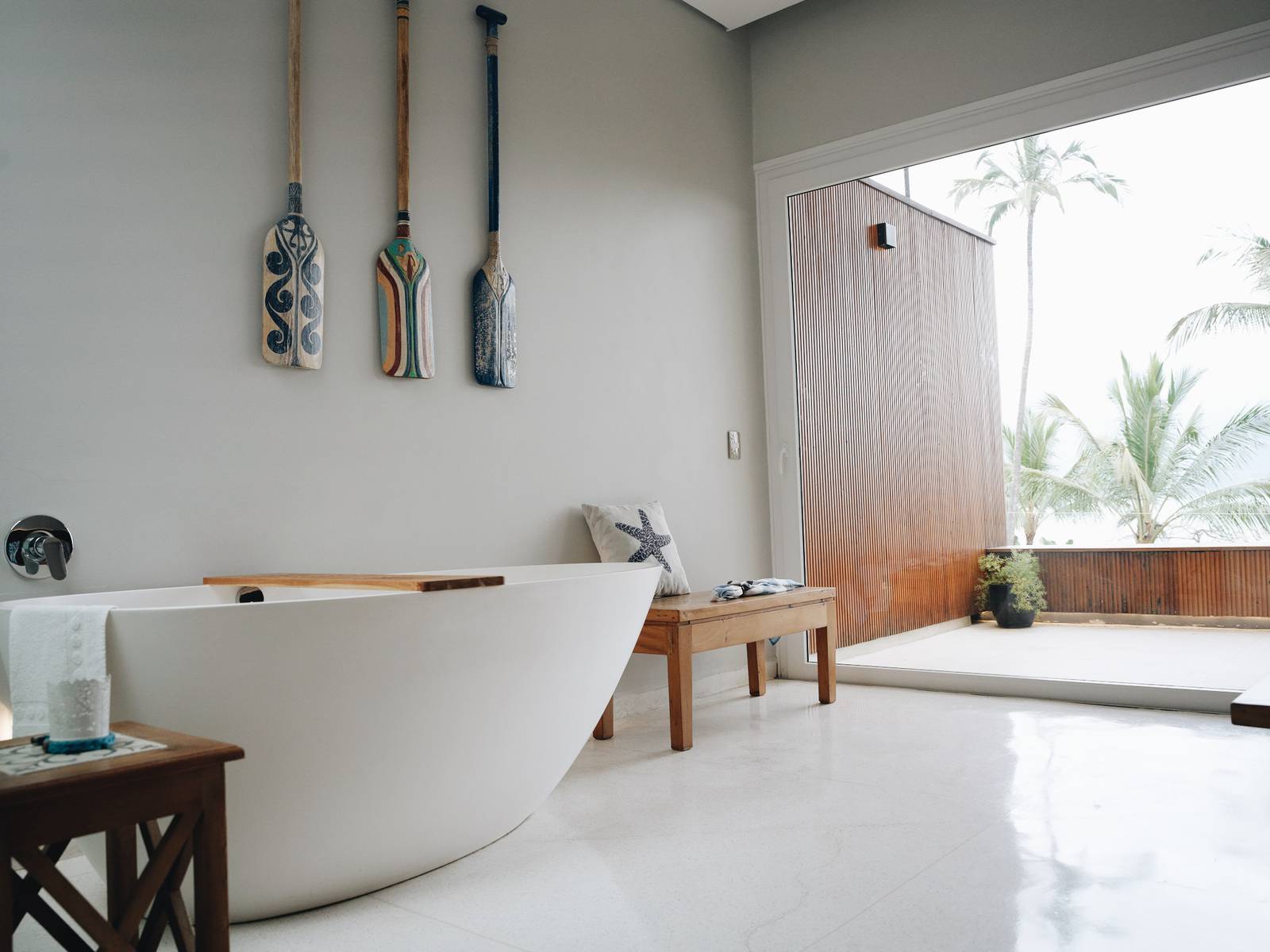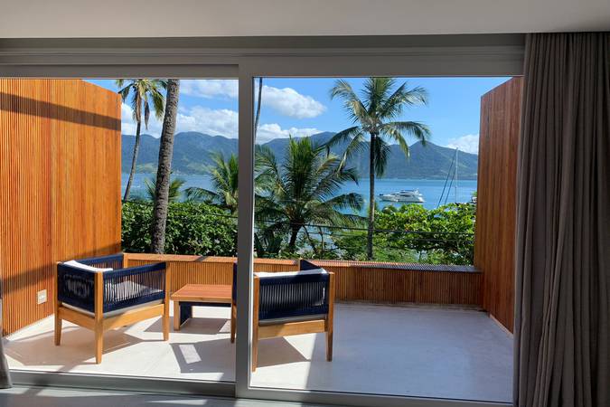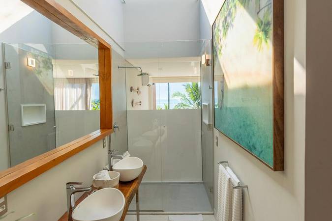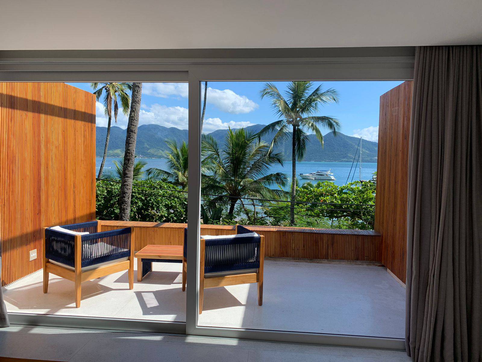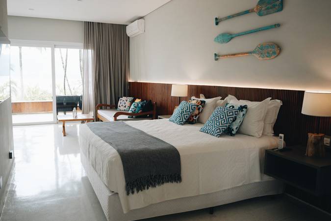 Com uma decoração moderna, vista deslumbrante para o mar a partir de sua varanda privativa, banheira de imersão e amenities de banho Natura.